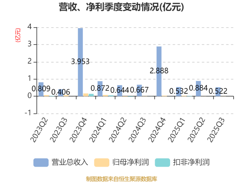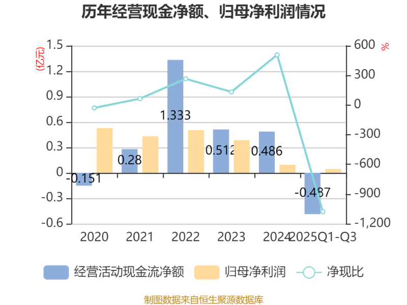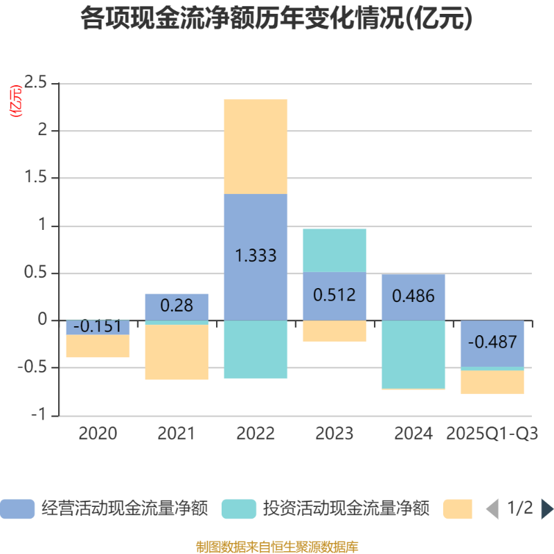 2025年前三季度,公司经营活动现金流净额为-4867.2万元,同比增加5414.09万元;筹资活动现金流净额-2454.15万元,同比减少2184.03万元;投资活动现金流净额-400.84万元,上年同期为-7572.79万元。