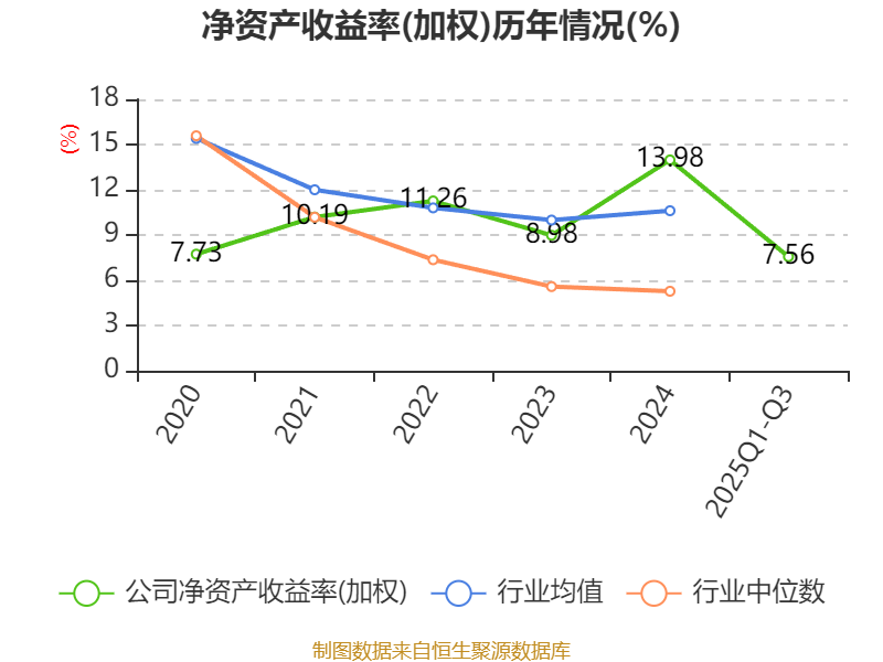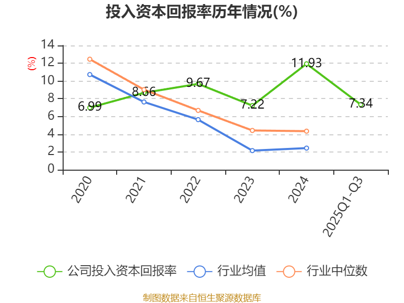 盈利能力方面, 2025年前三季度公司加权平均净资产收益率为7.56%,同比下降1.08个百分点。公司2025年前三季度投入资本回报率为7.34%,较上年同期下降1.89个百分点。