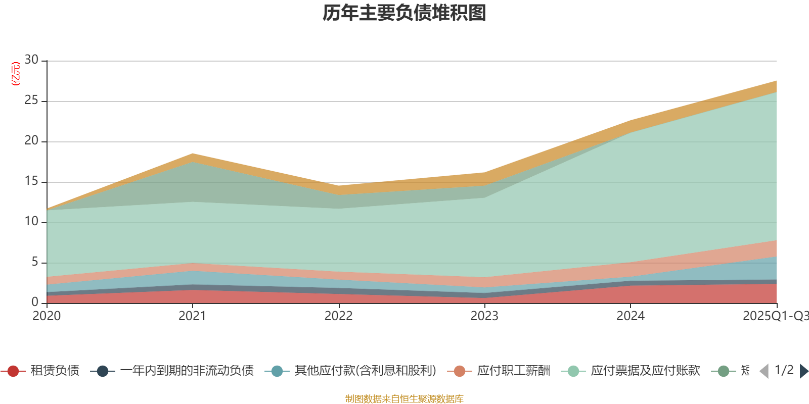 负债重大变化方面,截至2025年三季度末,公司其他应付款(含利息和股利)较上年末增加468.09%,占公司总资产比重上升2.9个百分点;应付票据及应付账款较上年末增加14.35%,占公司总资产比重上升1.39个百分点;应交税费较上年末减少47.5%,占公司总资产比重下降0.35个百分点;一年内到期的非流动负债较上年末减少10.23%,占公司总资产比重下降0.13个百分点。