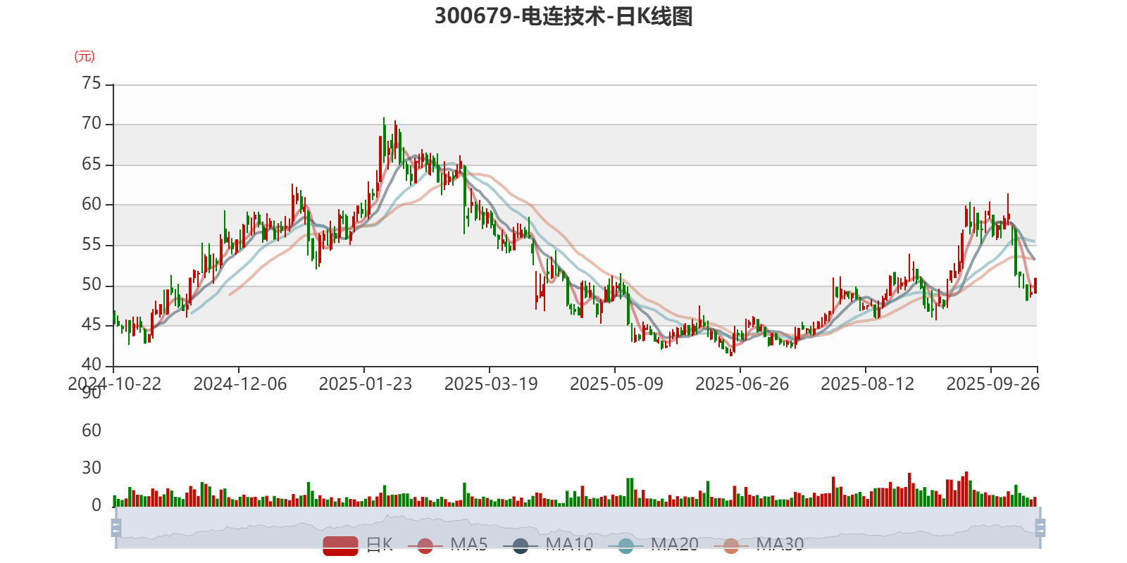 以10月21日收盘价计算,电连技术目前市盈率(TTM)约为40.28倍,市净率(LF)约4.3倍,市销率(TTM)约4.03倍。