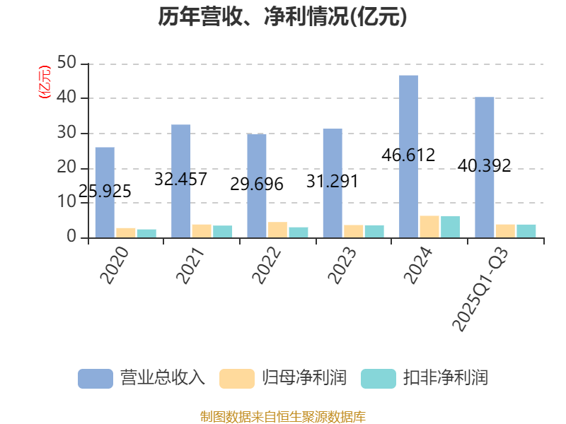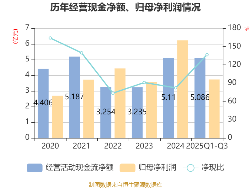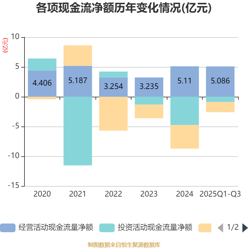 2025年前三季度,公司经营活动现金流净额为5.09亿元,同比增长2.56%;筹资活动现金流净额-1.72亿元,同比增加7244.13万元;投资活动现金流净额-8801.3万元,上年同期为-4.32亿元。