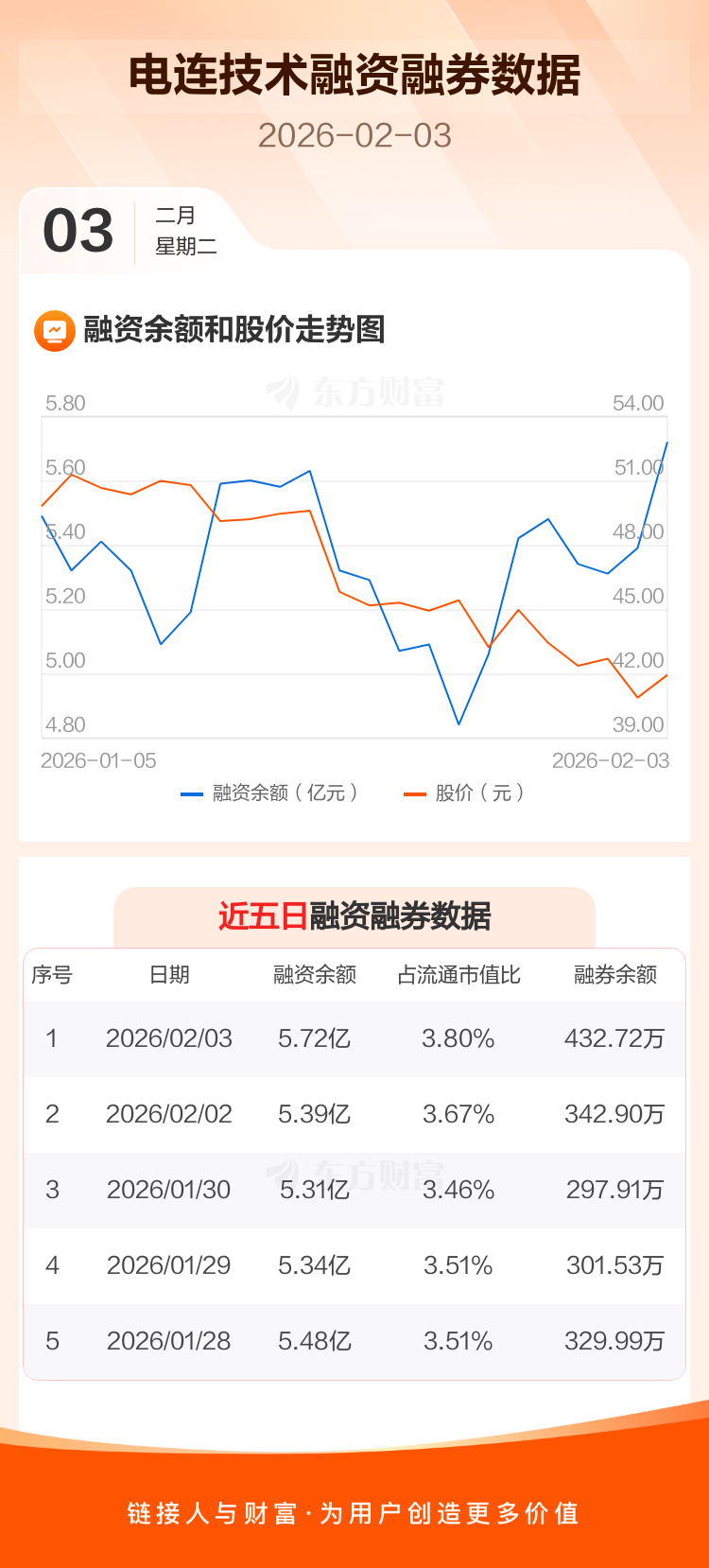 交易所最新数据显示,电连技术于2026年2月3日获融资买入5542.84万元,融资偿还2245.88万元,当日融资净买入3296.96万元。目前,该股融资余额5.72亿,占流通市值比例为3.80%。