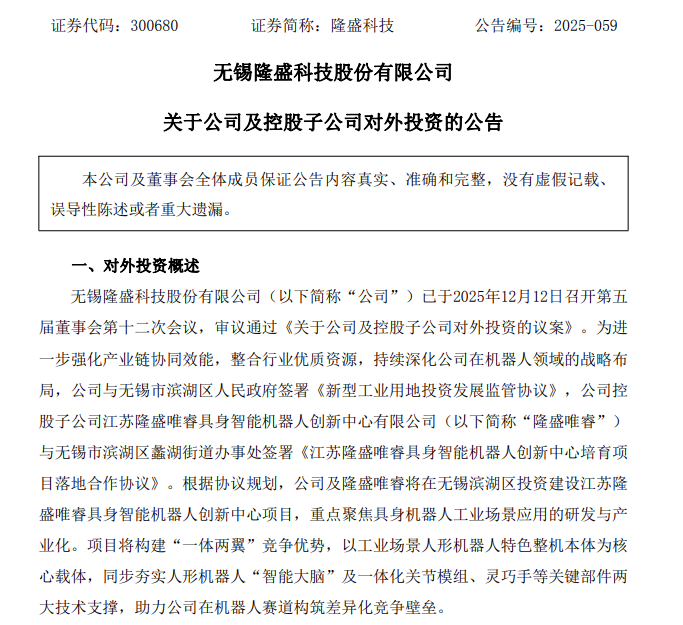 隆盛科技(300680)12月12日晚间公告,公司及控股子公司隆盛唯睿与无锡市滨湖区人民政府、蠡湖街道办事处签署合作协议,投资建设江苏隆盛唯睿具身智能机器人创新中心项目。