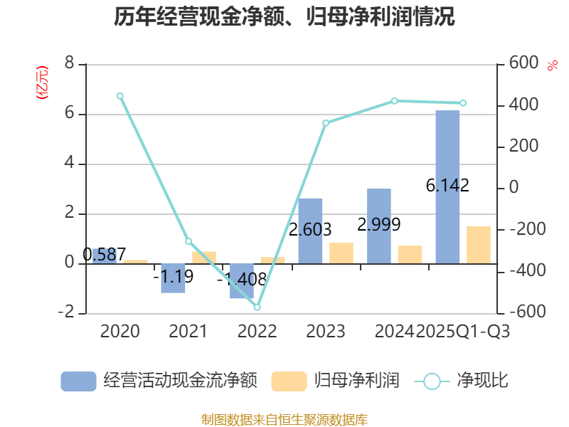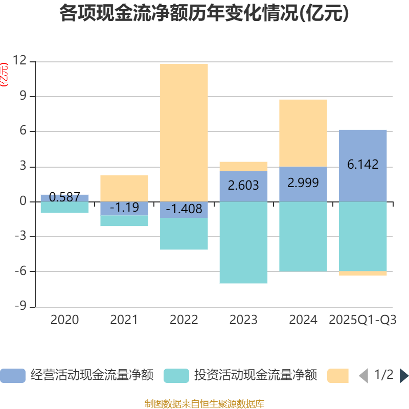 2025年前三季度,公司经营活动现金流净额为6.14亿元,同比下降12.51%;筹资活动现金流净额-3729.82万元,同比减少1877.12万元;投资活动现金流净额-5.96亿元,上年同期为-4.86亿元。