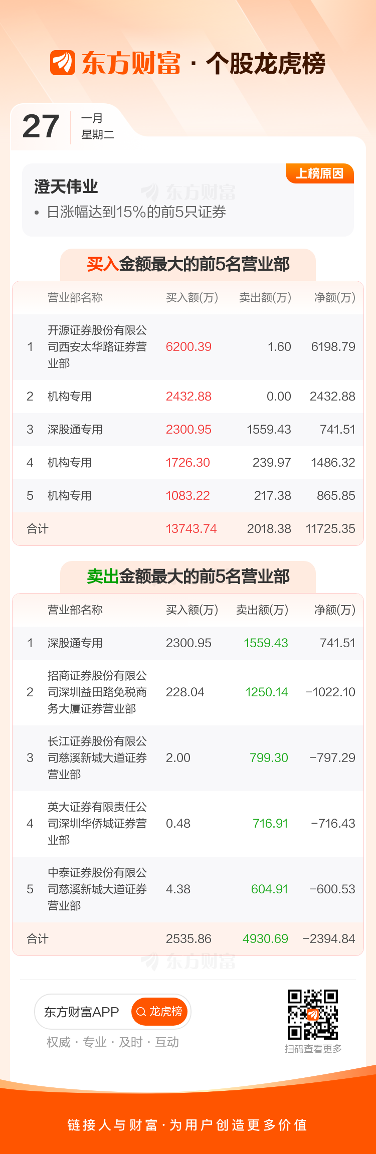 交易所2026年1月27日公布的交易公开信息显示,澄天伟业因成为日涨幅达到15%的前5只证券上榜。澄天伟业当日收报53.3元,涨跌幅19.99%,偏离值20.00%,换手率8.27%,成交额4.20亿。