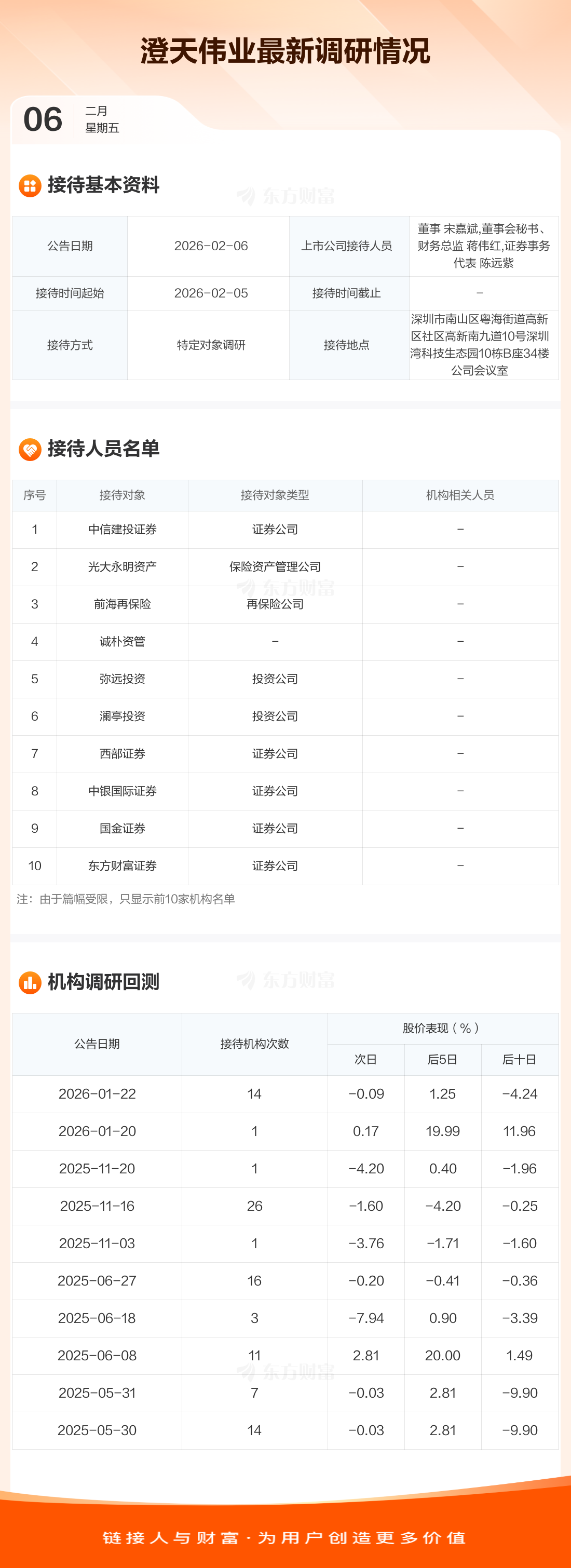 澄天伟业2月6日公告称,2月5日接待中信建投证券等14家机构调研。接待人员包括董事 宋嘉斌,董事会秘书、财务总监 蒋伟红,证券事务代表 陈远紫。