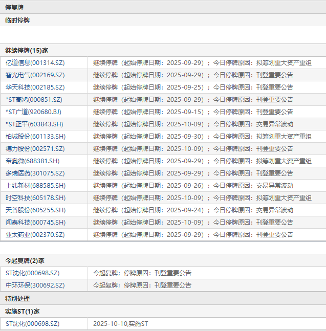10月10日盘前停复牌汇总