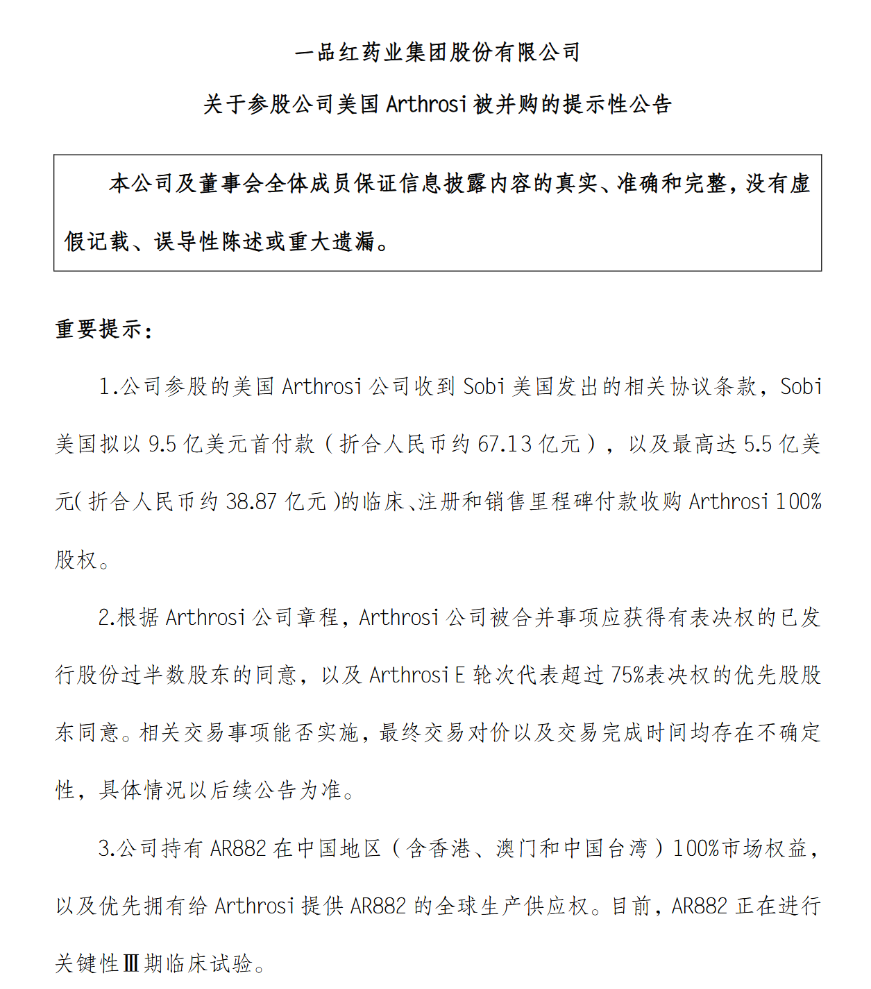 在此经营现实下,一品红潜在的资产出售交易未能改变市场既有判断。一品红通过子公司持有Arthrosi的13.45%股权,此次收购方瑞典药企Sobi旗下子公司拟支付9.5亿美元首付款,以及最高5.5亿美元里程碑付款,潜在总对价15亿美元。交易完成后,一品红将不再持股,但保留AR882在中国地区的全部市场权益,以及全球生产供应的优先权。
