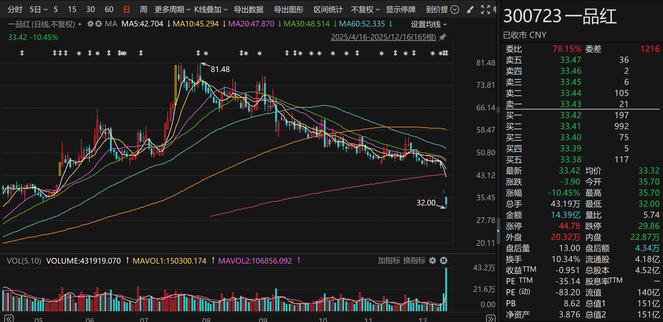 12月15日,公司股价被摁在20%跌停板上,次日继续下跌10.45%,收报33.42元/股。