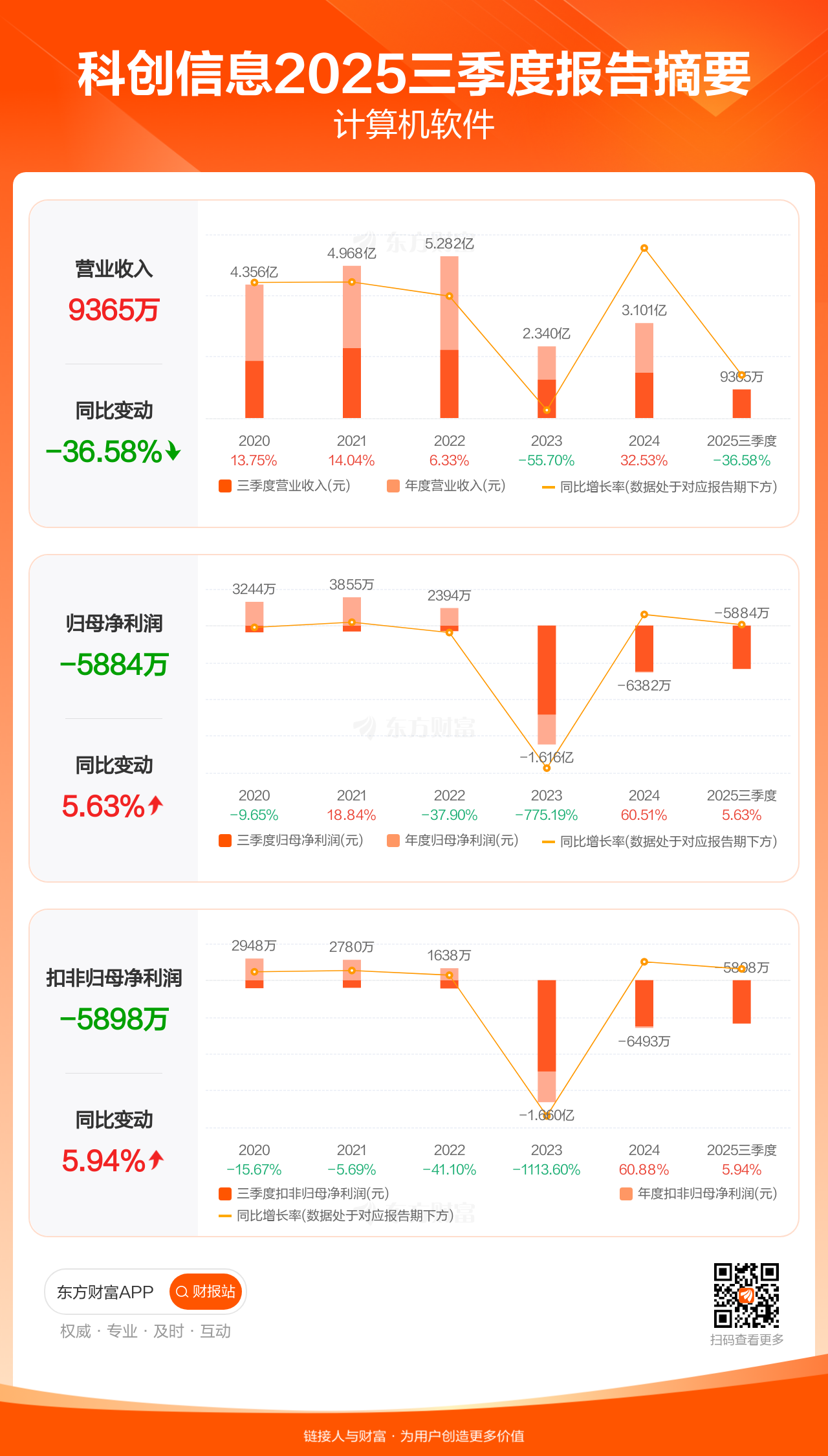 科创信息10月29日发布2025年三季报显示,公司前三季实现营业收入9364.96万元,同比下滑36.58%;归母净利润-5884.21万元;扣非归母净利润-5897.82万元。