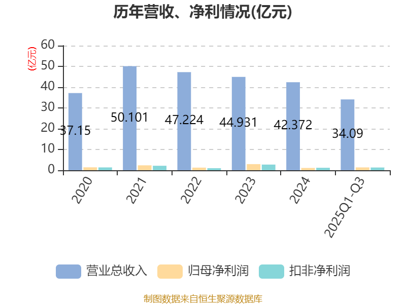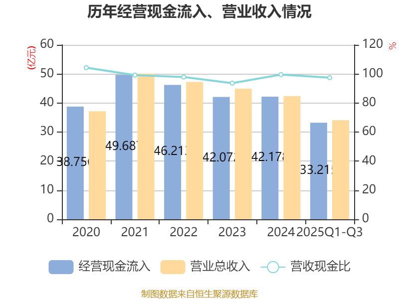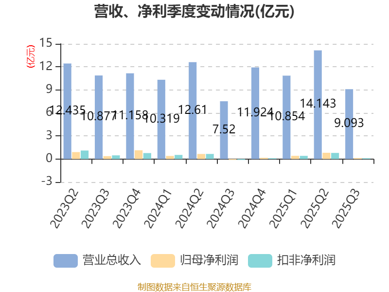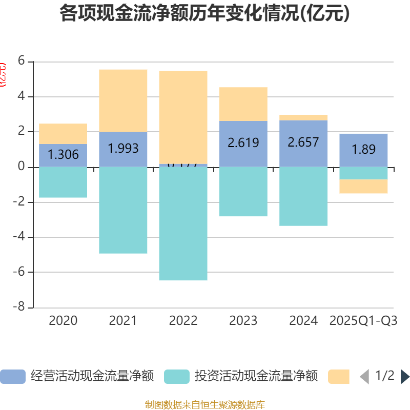 2025年前三季度,公司经营活动现金流净额为1.89亿元,同比增加2.73亿元;筹资活动现金流净额-7910.23万元,同比减少1.2亿元;投资活动现金流净额-7162.33万元,上年同期为-1.71亿元。