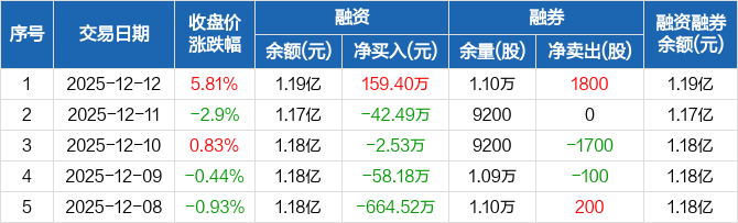 华宝股份:融资净买入159.4万元,融资余额1.19亿元(12-12)