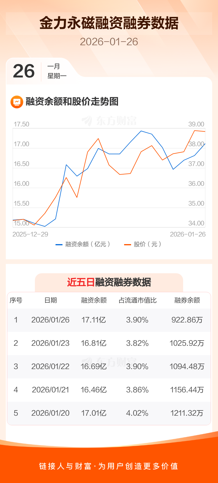 交易所最新数据显示,金力永磁于2026年1月26日获融资买入3.08亿元,融资偿还2.77亿元,当日融资净买入3044.63万元。目前,该股融资余额17.11亿,占流通市值比例为3.90%。