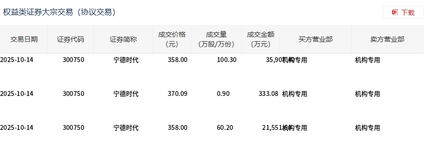 10月14日,宁德时代大宗交易成交161.4万股,成交额5.78亿元,占当日总成交额的3.06%,成交均价358.07元,较市场收盘价358元溢价0.02%,其中最高成交价370.09元,最低成交价358元。