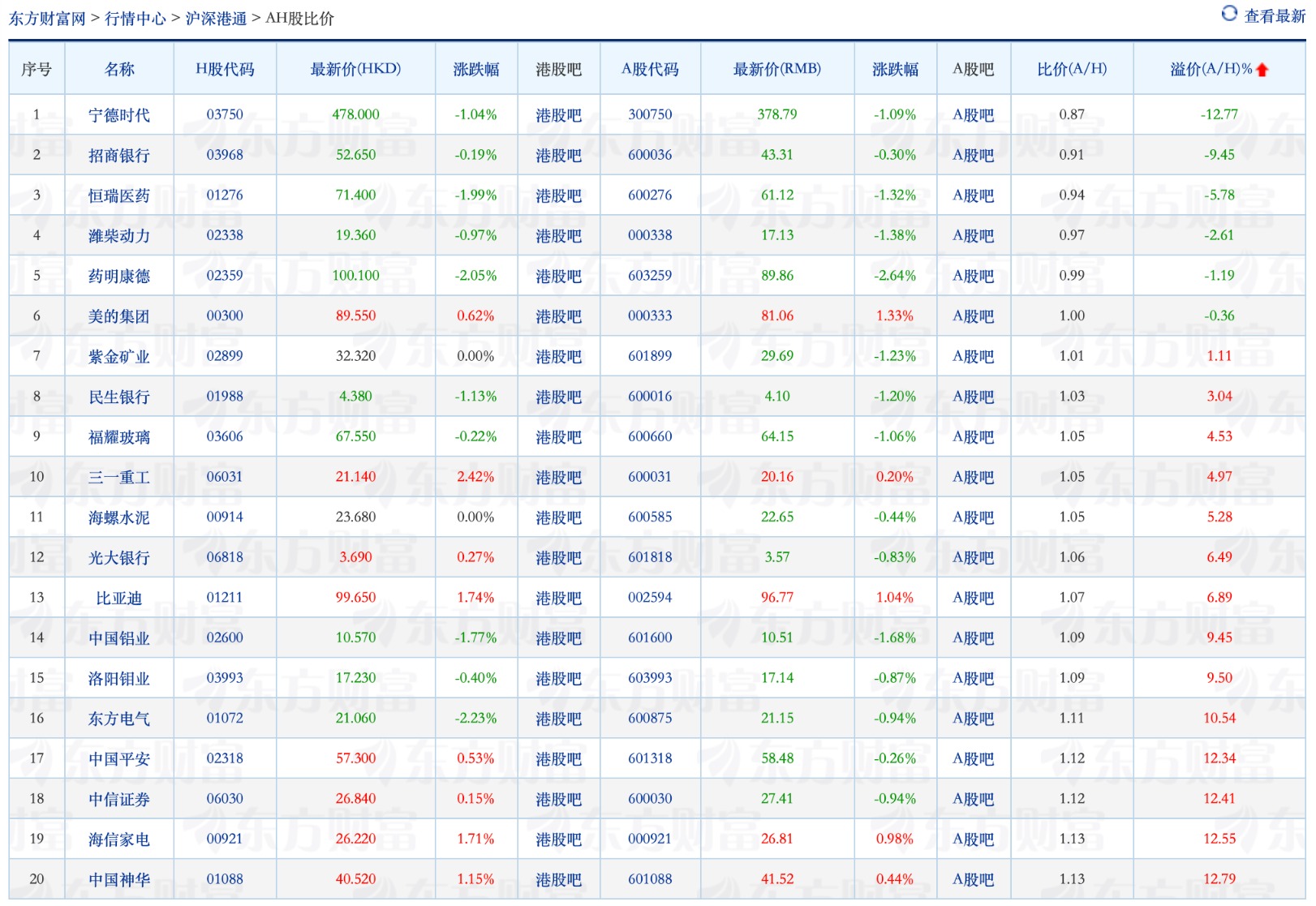 公开信息显示,AH股价格“倒挂”的6家公司分别是:宁德时代、招商银行、恒瑞医药、潍柴动力、药明康德、美的集团;AH股价格比较贴近的则有紫金矿业、民生银行、福耀玻璃、三一重工、海螺水泥、比亚迪等。