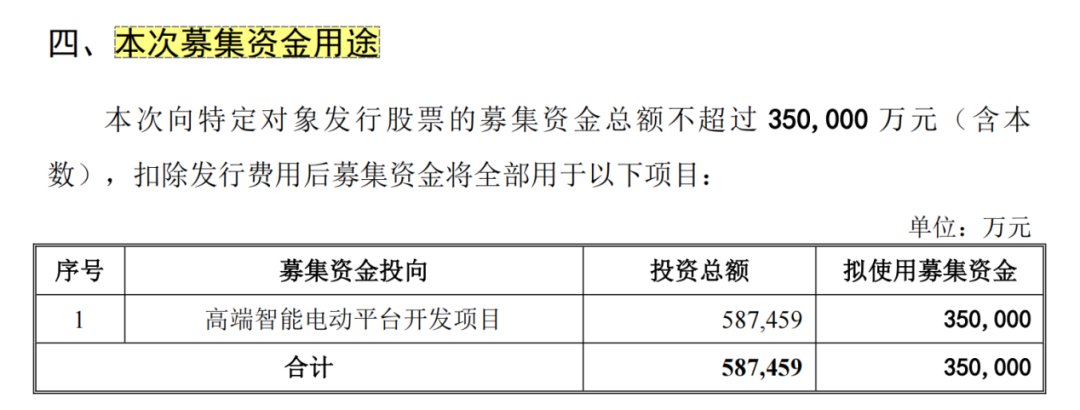 募集说明书显示,江淮汽车本次向特定对象发行股票的募集资金总额不超过35亿元(含本数),扣除发行费用后募集资金将全部用于高端智能电动平台开发项目。