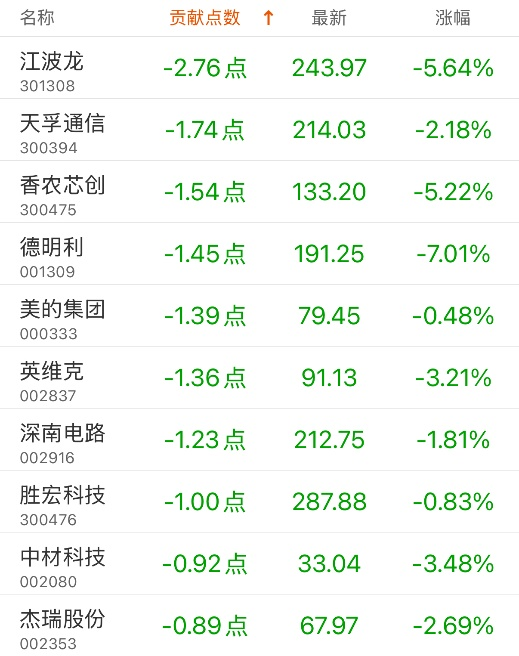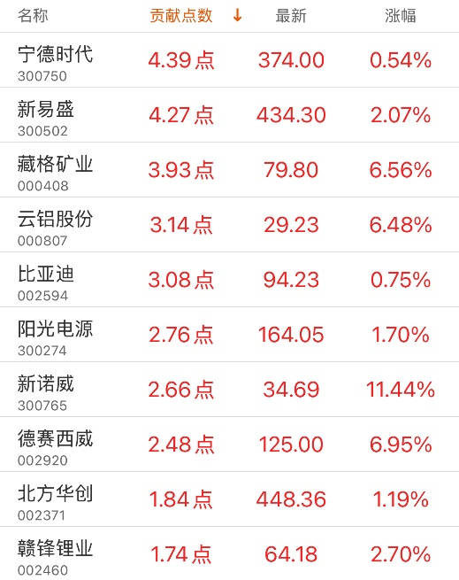 对深证成指贡献点数最多的个股是宁德时代,贡献4.39点,该股当日涨0.54%,收盘价374元;拖累点数最多的个股是江波龙,拖累2.76点,该股当日跌5.64%,收盘价243.97元。