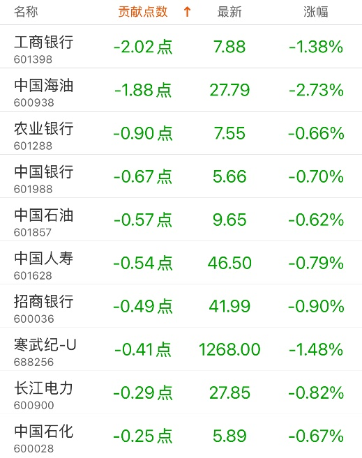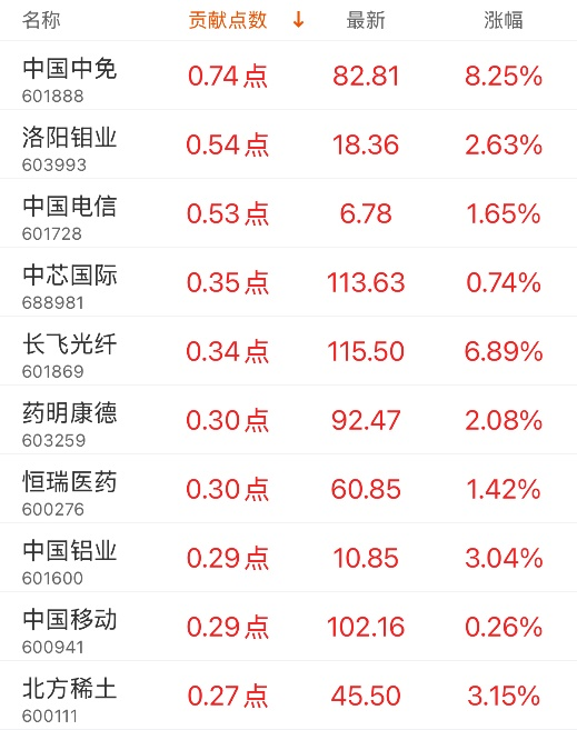 对上证指数贡献点数最多的个股是中国中免,贡献0.74点,该股当日涨8.25%,收盘价82.81元;拖累点数最多的个股是工商银行,拖累2.02点,该股当日跌1.38%,收盘价7.88元。