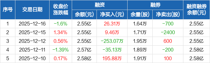 融资方面,当日融资买入902.06万元,融资偿还875.75万元,融资净买入26.31万元。融券方面,融券卖出0股,融券偿还700股,融券余量1.64万股,融券余额29.19万元。融资融券余额合计2.55亿元。