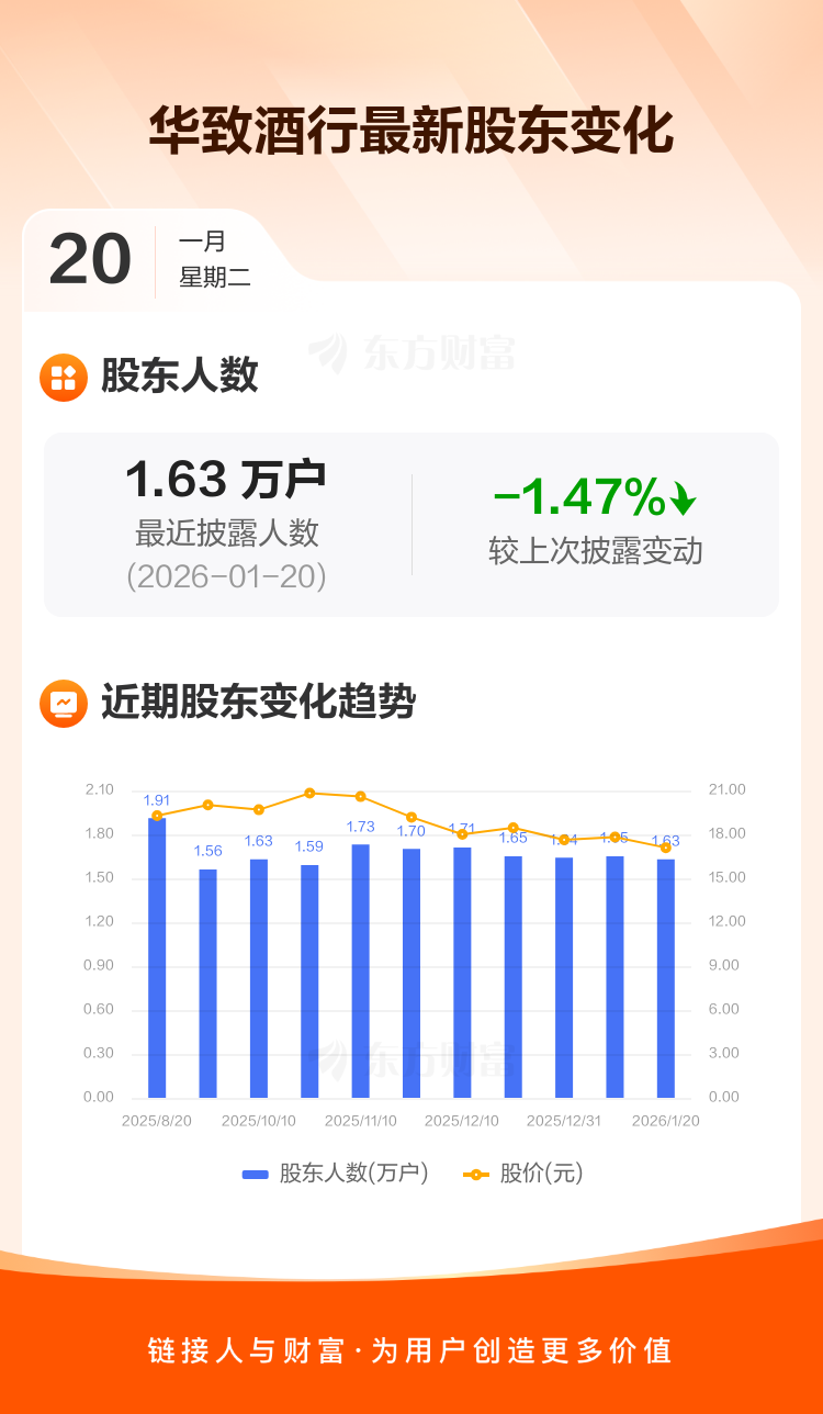 华致酒行最新披露数据显示,截至1月20日公司股东户数为1.63万户,较上期(2026年1月9日)减少243户,降幅为1.47%。户均持有流通股数量由上期的2.52万股上升至2.55万股,户均持股金额由上期的44.82万元减少至43.65万元。
