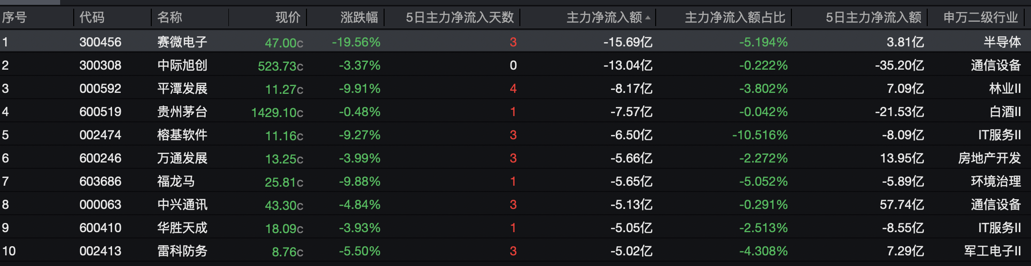 当日主力资金净流出额排名前十个股包括,赛微电子、中际旭创、平潭发展、贵州茅台、榕基软件、万通发展、福龙马、中兴通讯、华胜天成、雷科防务。净流出额均超5亿元,其中,最高为赛微电子,净流出额超15亿元。IT服务、软件开发、半导体板块资金净流出额位列前三,分别为50.93亿元、28.92亿元、26.21亿元。