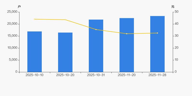自2025年10月20日以来,公司股东户数连续3期上涨,截至目前增幅为41.95%。2025年10月20日至2025年11月28日区间股价下降25.54%。