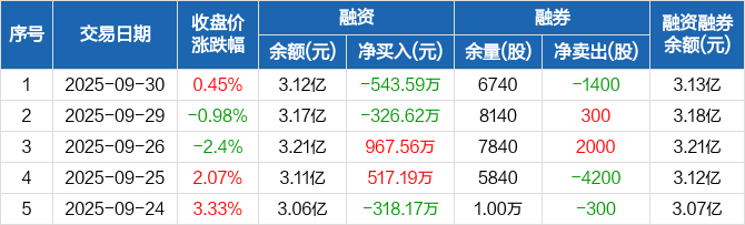 帝尔激光:融资净偿还543.59万元,融资余额3.12亿元(09-30)