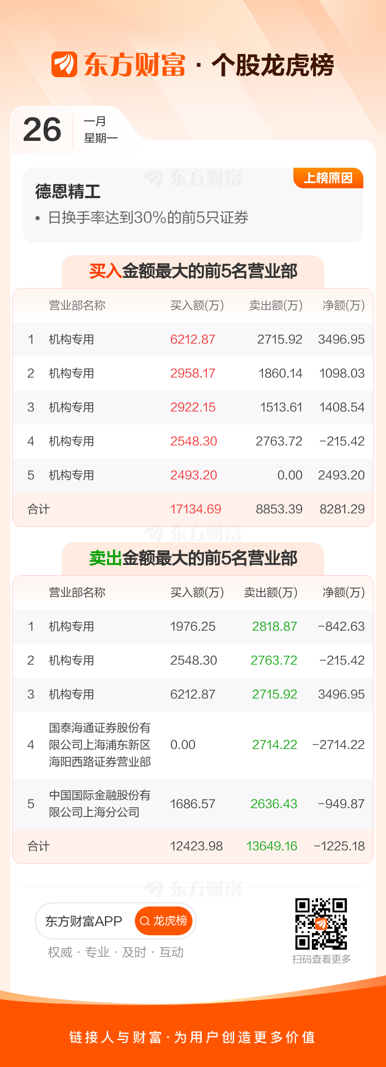 交易所2026年1月26日公布的交易公开信息显示,德恩精工因成为日换手率达到30%的前5只证券上榜。德恩精工当日收报30.02元,涨跌幅-4.15%,偏离值40.03%,换手率40.12%,成交额13.32亿。