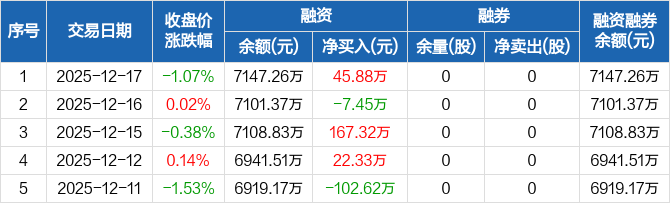 利安科技:融资净买入45.88万元,融资余额7147.26万元(12-17)