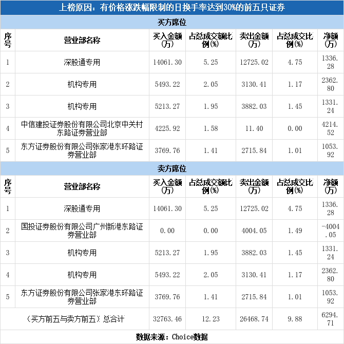 龙虎榜数据显示,今日共4个机构席位出现在龙虎榜单上,分别位列买二、买三、卖三、卖四,合计净买入3694.04万元,占龙虎榜净买额的58.68%。除此之外还有德科立、航天发展、盛新锂能等38只个股榜单上出现了机构的身影,其中17家呈现机构净买入,获净买入最多的是航天发展,净买额为1.47亿元;21家呈现机构净卖出,其中遭净卖出最高的为德科立,净卖额为1.50亿元。
