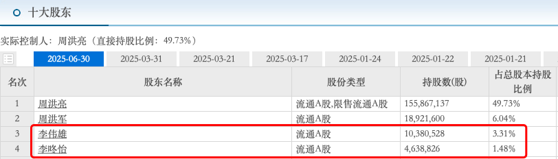 截至2025年6月30日,李伟雄和李咚怡分别持有公司股份10,380,528股(持股占比3.31%)和 4,638,826股(持股占比1.48%),这意味着,两股东所持全部股份已彻底被“清空”。