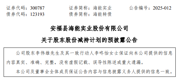 今年2月24日,海能实业公告称,公司股东李伟雄及其一致行动人李咚怡,因自身资金需求拟通过集中竞价和大宗交易方式,合计减持公司股份不超过391.79万股,即不超过剔除公司回购专用账户后的总股本比例的1.5%。计划减持期间为2025年3月18日至2025年6月17日。