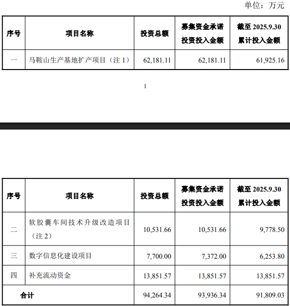根据公告,为提高募集资金使用效率,公司将“马鞍山生产基地扩产项目”调减建设投资规模后予以结项。并将原拟投入“华东研发中心建设项目”的募集资金10,531.66万元全部投向“软胶囊车间技术升级改造项目”,公司“软胶囊车间技术升级改造项目”的全部投资建设内容已经建成投产,公司对该项目予以结项。