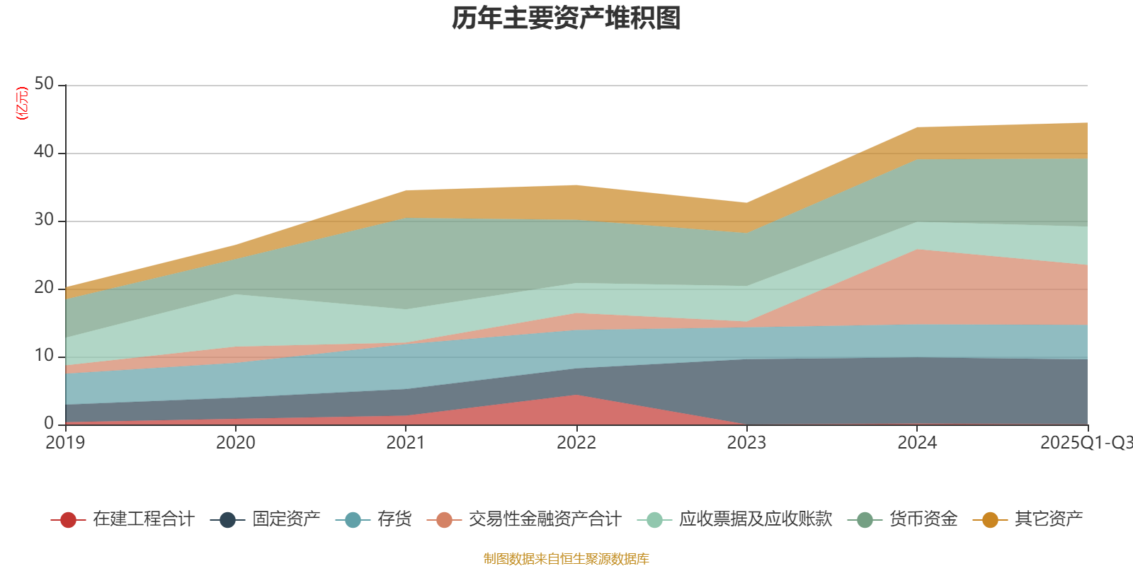 资产重大变化方面,截至2025年三季度末,公司交易性金融资产合计较上年末减少20.28%,占公司总资产比重下降5.43个百分点;应收票据及应收账款较上年末增加41.11%,占公司总资产比重上升3.58个百分点;货币资金较上年末增加8.74%,占公司总资产比重上升1.49个百分点;其他流动资产较上年末增加39.86%,占公司总资产比重上升0.97个百分点。