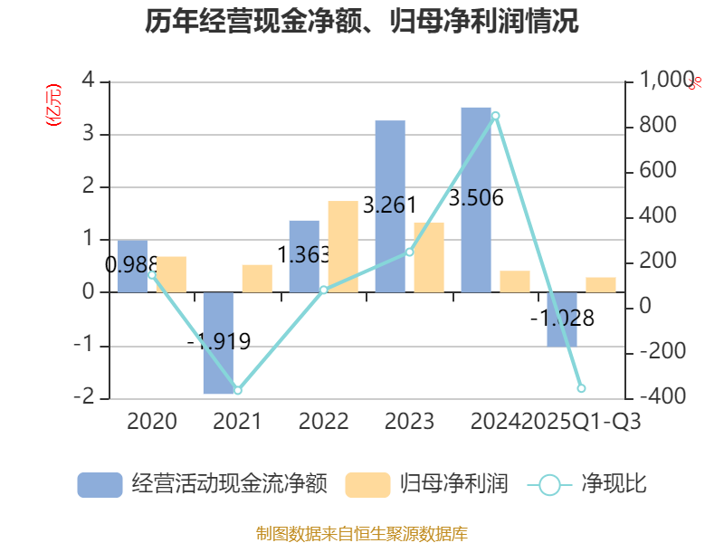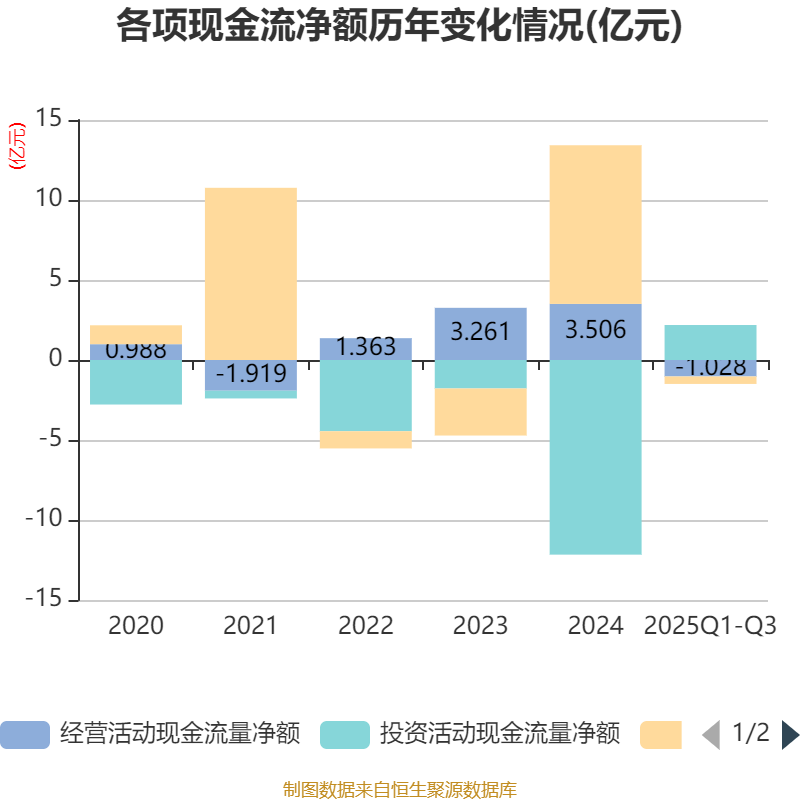 2025年前三季度,公司经营活动现金流净额为-1.03亿元,同比减少2.71亿元;筹资活动现金流净额-4677.67万元,同比减少12.36亿元;投资活动现金流净额2.19亿元,上年同期为-11.27亿元。