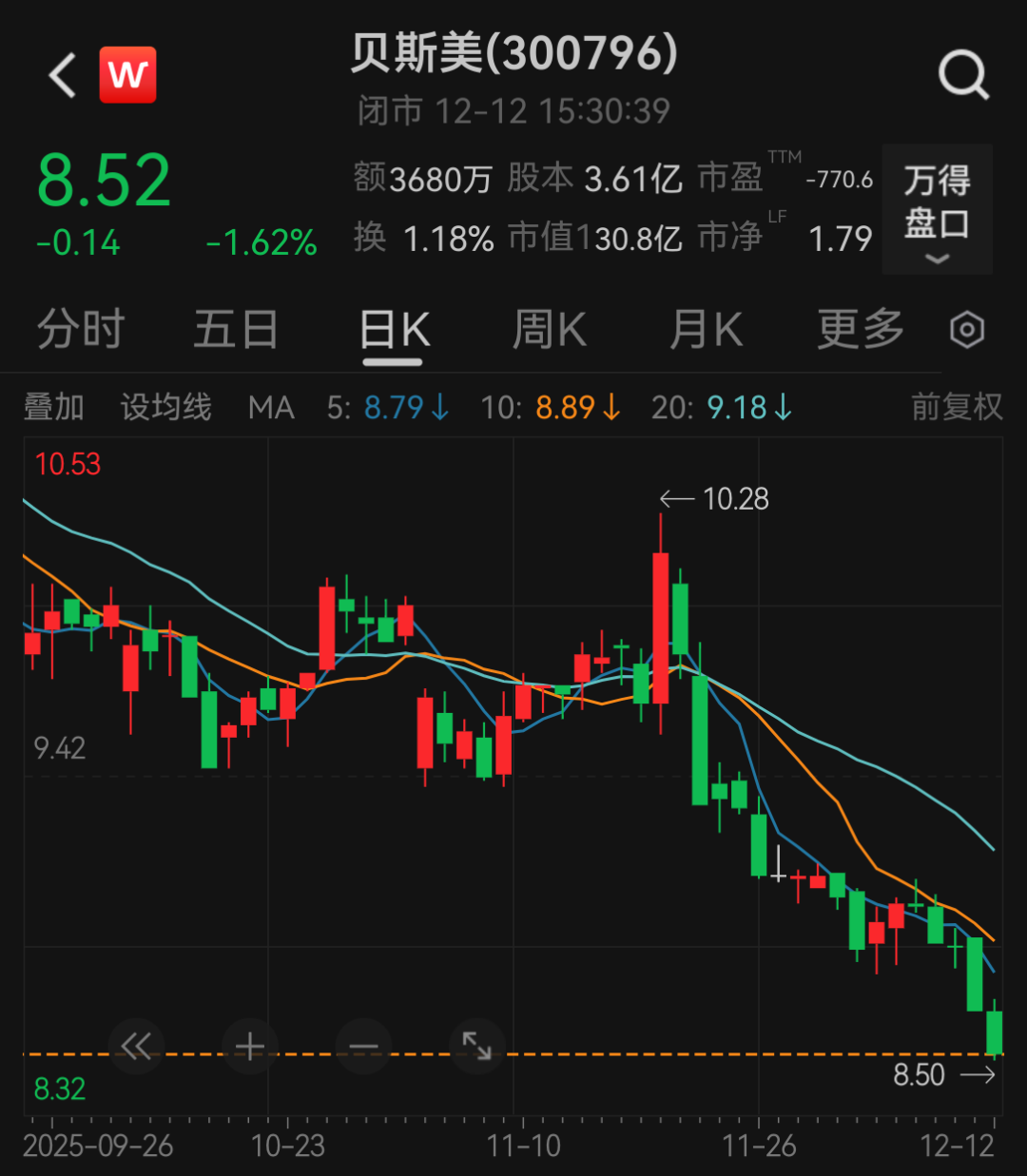自11月20日以来,贝斯美股价持续下跌。12月12日,贝斯美股价以8.52元/股报收,最新市值为30.8亿元。