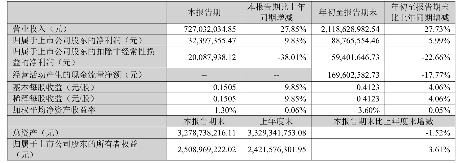 中证智能财讯泰和科技(300801)10月21日披露2025年第三季度报告。前三季度公司实现营业总收入21.19亿元,同比增长27.73%;归母净利润8876.56万元,同比增长5.99%;扣非净利润5940.16万元,同比下降22.66%;经营活动产生的现金流量净额为1.7亿元,同比下降17.77%;报告期内,泰和科技基本每股收益为0.4123元,加权平均净资产收益率为3.60%。