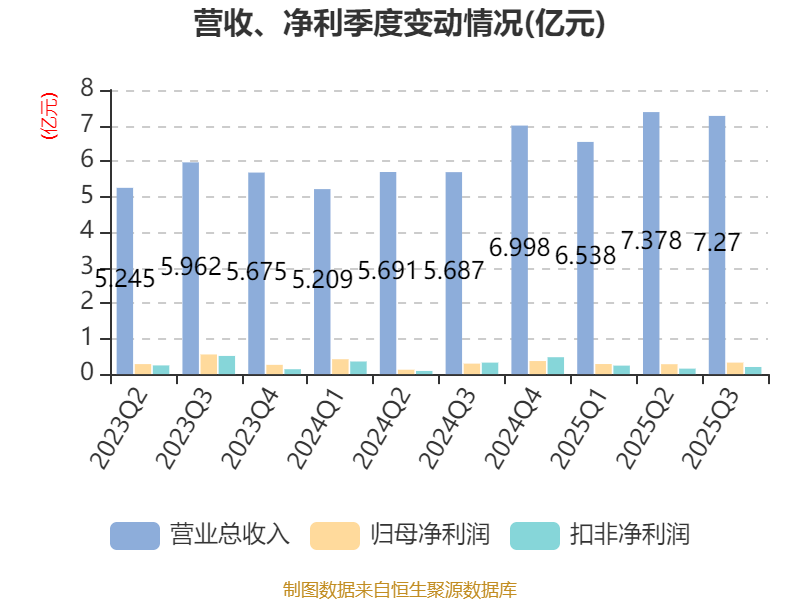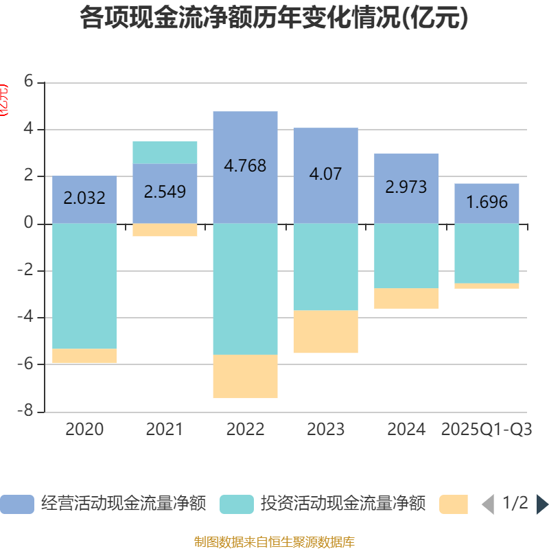 2025年前三季度,公司经营活动现金流净额为1.7亿元,同比下降17.77%;筹资活动现金流净额-2283.85万元,同比增加2738.35万元;投资活动现金流净额-2.54亿元,上年同期为-3.53亿元。