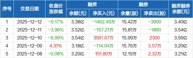 东岳硅材融资融券信息显示,2025年12月12日融资净偿还1462.49万元;融资余额3.38亿元,较前一日下降4.15%。