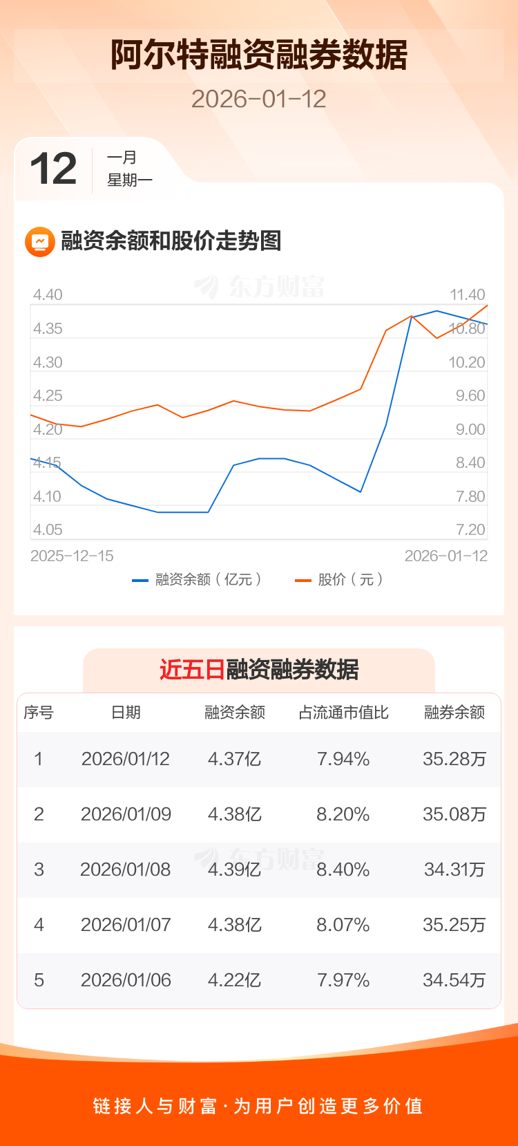 交易所最新数据显示,阿尔特于2026年1月12日获融资买入3992.35万元,融资偿还4066.98万元,当日融资净偿还74.63万元。目前,该股融资余额4.37亿,占流通市值比例为7.94%。