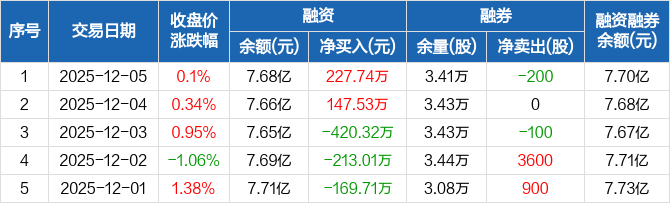新产业:融资净买入227.74万元,融资余额7.68亿元(12-05)