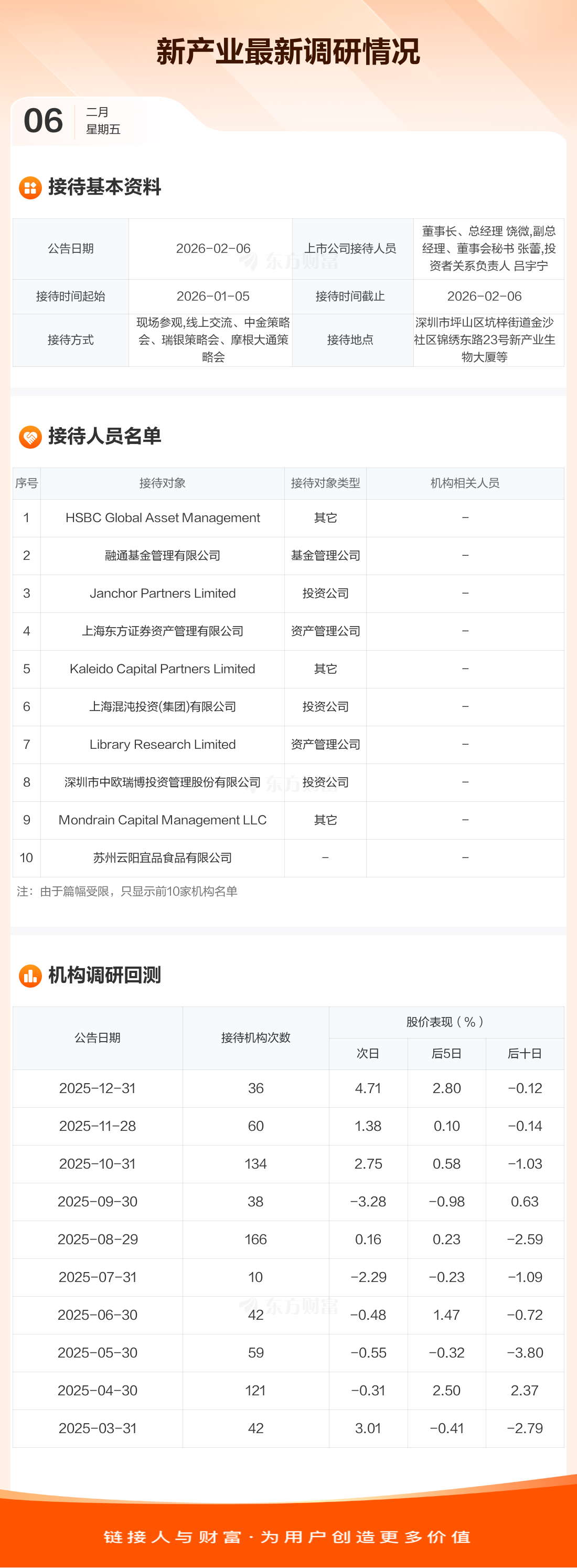 新产业2月6日公告称,1月5日至2月6日接待HSBC Global Asset Management等26家机构调研。接待人员包括董事长、总经理 饶微,副总经理、董事会秘书 张蕾,投资者关系负责人 吕宇宁。
