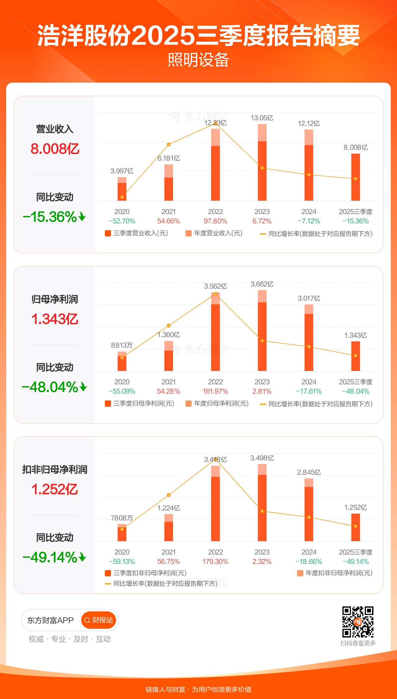 浩洋股份10月29日发布2025年三季报显示,公司前三季实现营业收入8.01亿元,同比下滑15.36%;归母净利润1.34亿元,同比下滑48.04%;扣非归母净利润1.25亿元,同比下滑49.14%。