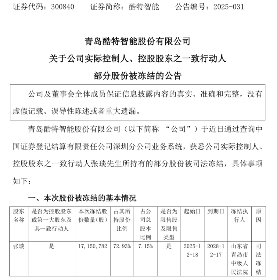 12月19日,酷特智能(300840)发布公告,公司实际控制人、控股股东之一致行动人张琰所持有的1715万股被司法冻结,占其所持股份的72.93%,占公司总股本的7.15%。
