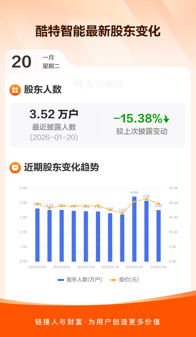 酷特智能:截至1月20日最新股东户数3.52万户,较上期减少15.38%