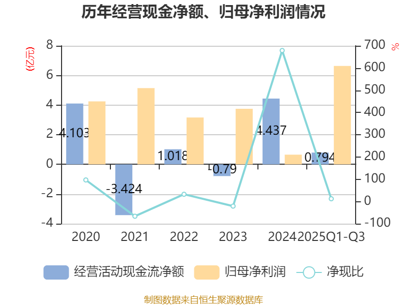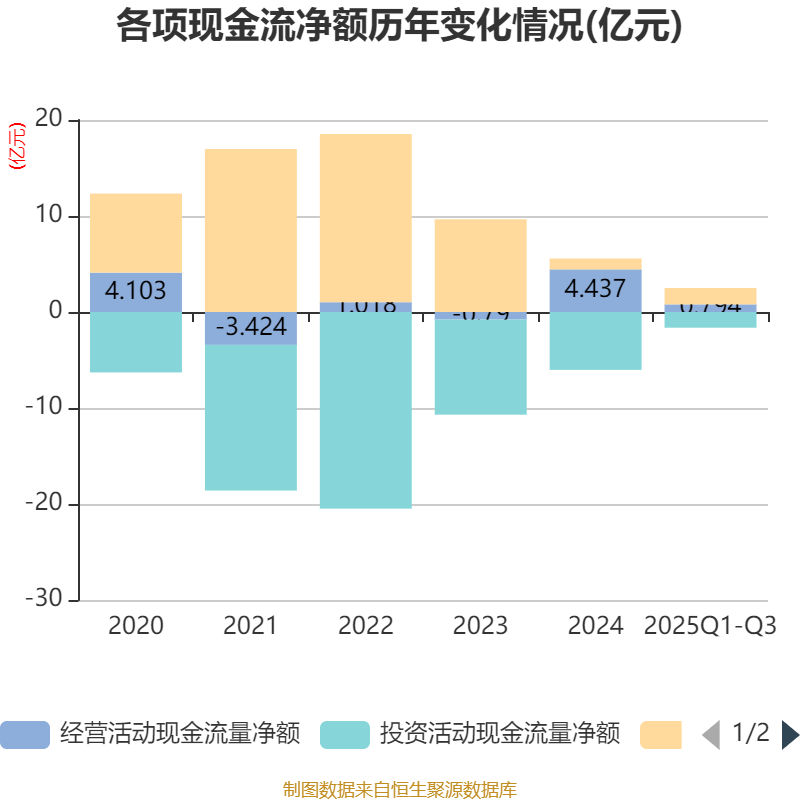 2025年前三季度,公司经营活动现金流净额为7937.33万元,同比下降79.36%;筹资活动现金流净额1.71亿元,同比减少2692.19万元;投资活动现金流净额-1.64亿元,上年同期为-5.91亿元。