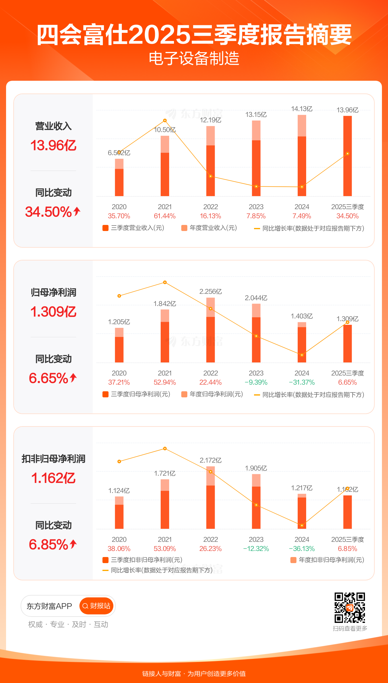 四会富仕10月27日发布2025年三季报显示,公司前三季实现营业收入13.96亿元,同比增长34.50%;归母净利润1.31亿元,同比增长6.65%;扣非归母净利润1.16亿元,同比增长6.85%。