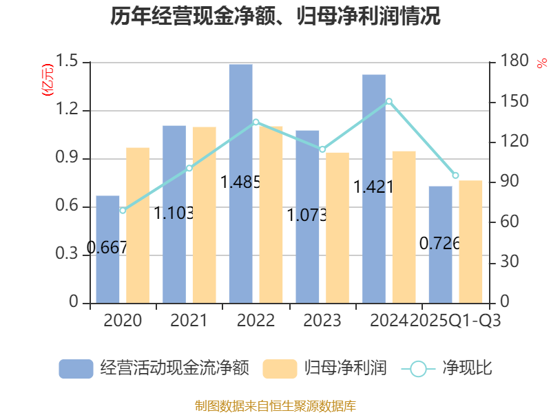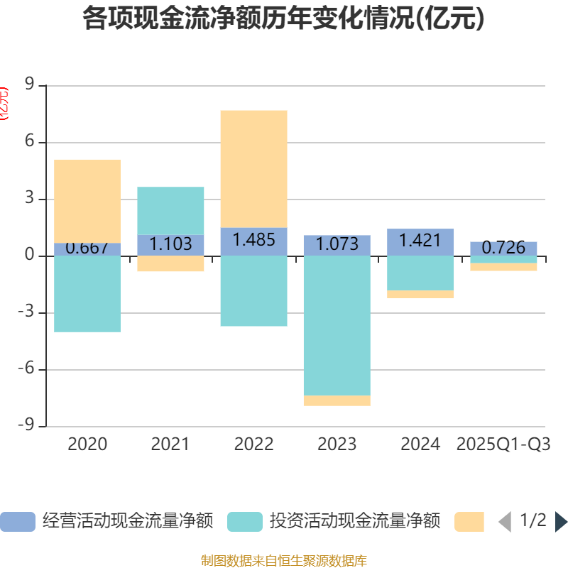 2025年前三季度,公司经营活动现金流净额为7259.83万元,同比下降32.57%;筹资活动现金流净额-4036.68万元,同比增加321.97万元;投资活动现金流净额-4008.14万元,上年同期为-1.26亿元。