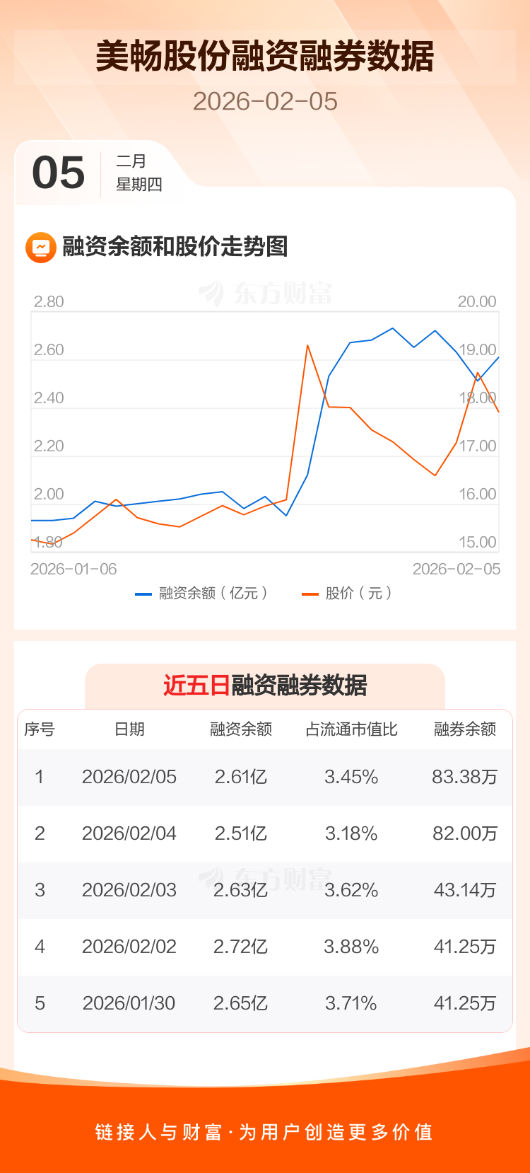 交易所最新数据显示,美畅股份于2026年2月5日获融资买入4922.01万元,融资偿还3985.46万元,当日融资净买入936.55万元。目前,该股融资余额2.61亿,占流通市值比例为3.45%。