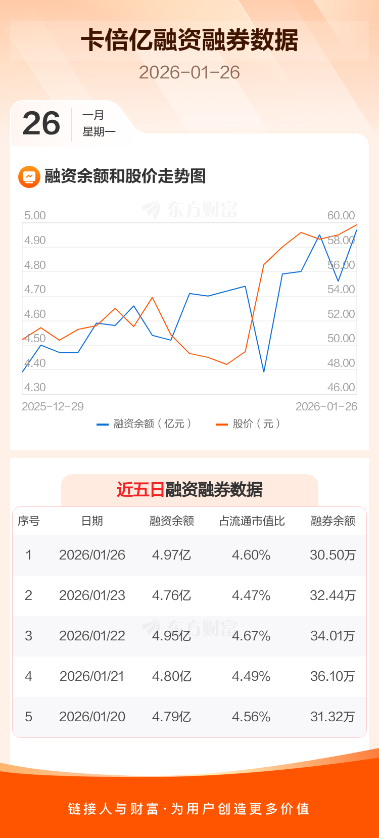 交易所最新数据显示,卡倍亿于2026年1月26日获融资买入6578.71万元,融资偿还4475.62万元,当日融资净买入2103.09万元。目前,该股融资余额4.97亿,占流通市值比例为4.60%。